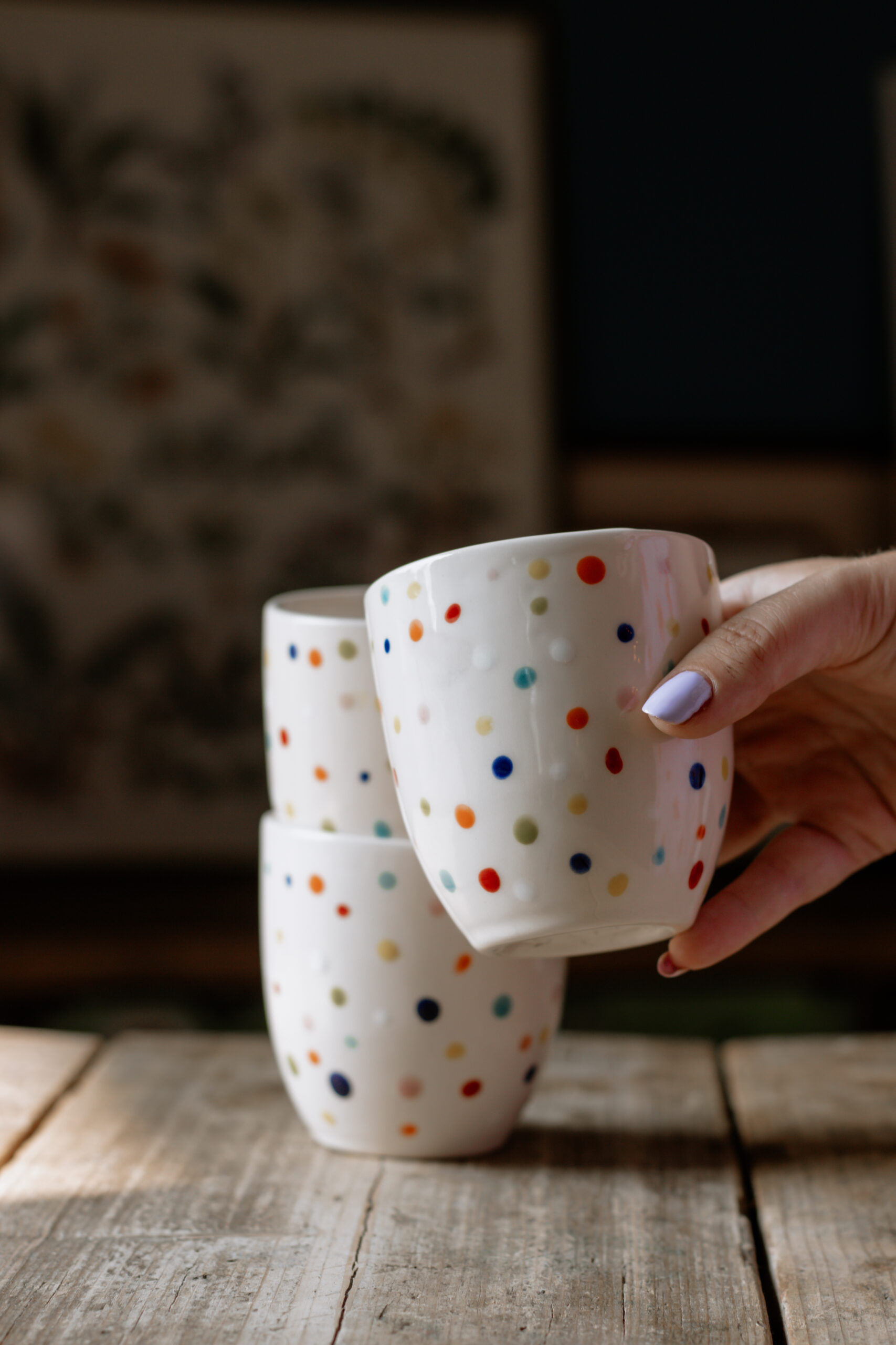 Tafelen met dit confetti servies is pas echt een feestje! De vrolijke stippen verschijnen in verschillende kleuren en maken elk moment aan tafel extra gezellig. Het servies wordt met de hand gemaakt in Atelier Noord, waardoor elk stuk uniek is en kan afwijken van de foto’s.