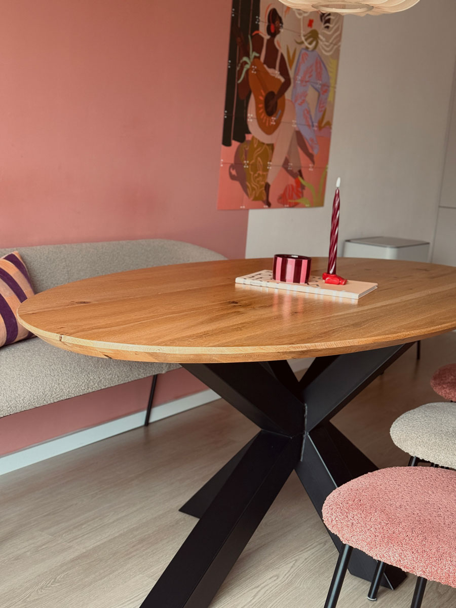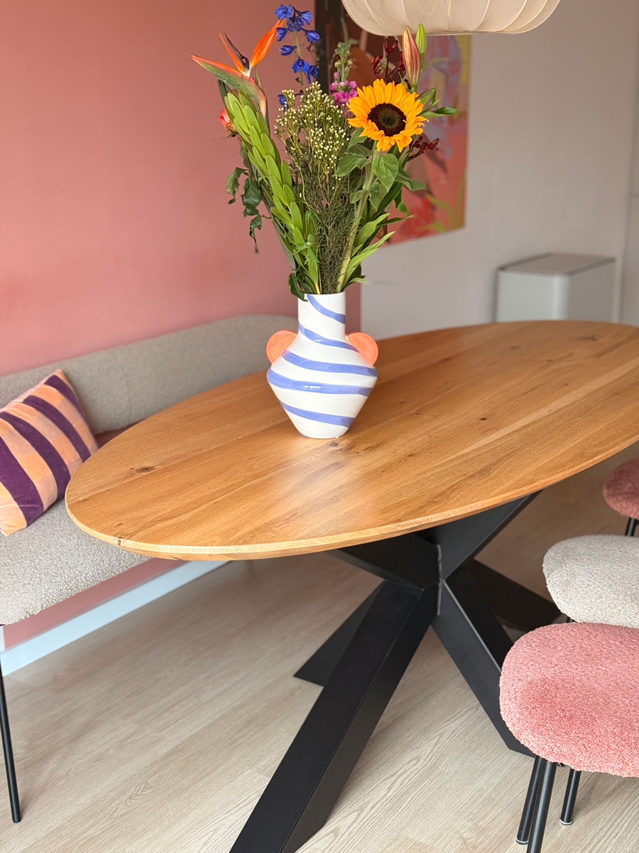 Deze tafel wordt met liefde en vakmanschap gemaakt op de Houtwerkplaats. Het prachtige ovale eiken blad ligt op een stoere matrixpoot van ijzer, waardoor de tafel zowel elegant als robuust oogt. Het gelakte blad benadrukt de natuurlijke nerf en geeft de tafel een warme uitstraling, perfect voor gezellige diners en creatieve werkmomenten.