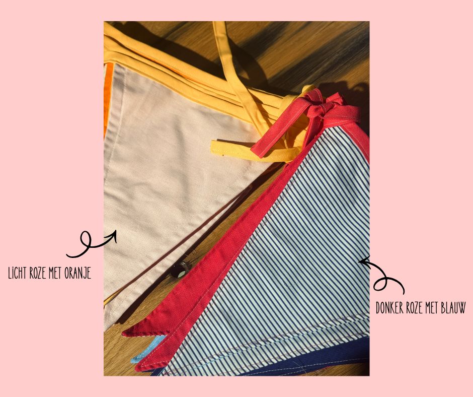 Licht roze met oranje ,Donker roze met blauw ,Blauw |